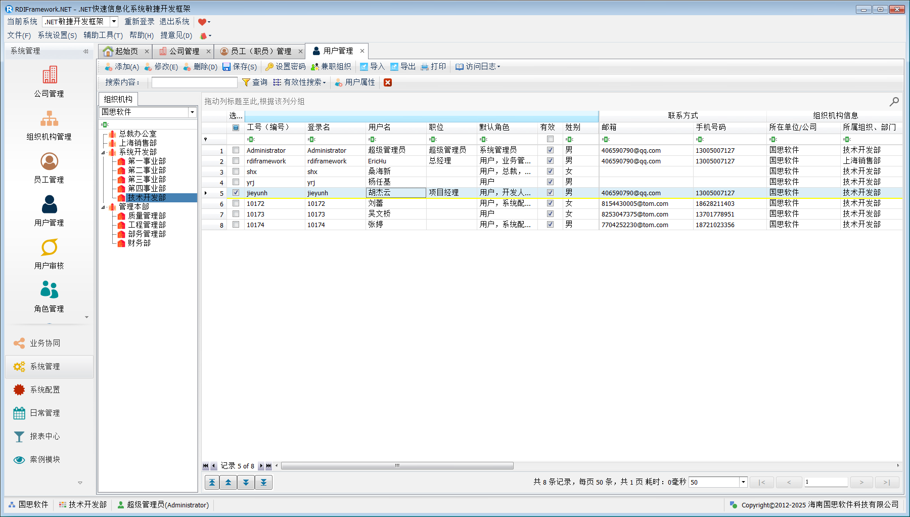用户管理对可登录系统的用户进行管理,后续的工作如:用户归属角色、权限的分配、用户所拥有的相应功能模块、各业务系统权限的分配、协同办公等都是以此为基础。用户管理的主要功能有:新增用户、修改用户、删除用户、设置用户的默认角色、设置用户密码、设置用户的有效性、设置用户主管、用户排序、用户导入、导出、用户兼职组织设置、用户模糊查询以及有效性搜索等。用户管理如下图所示。