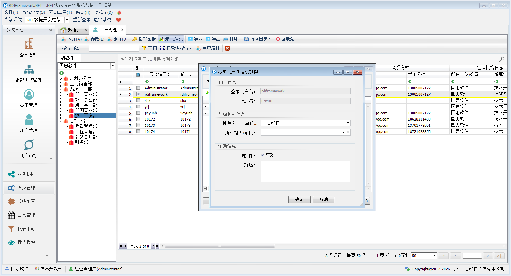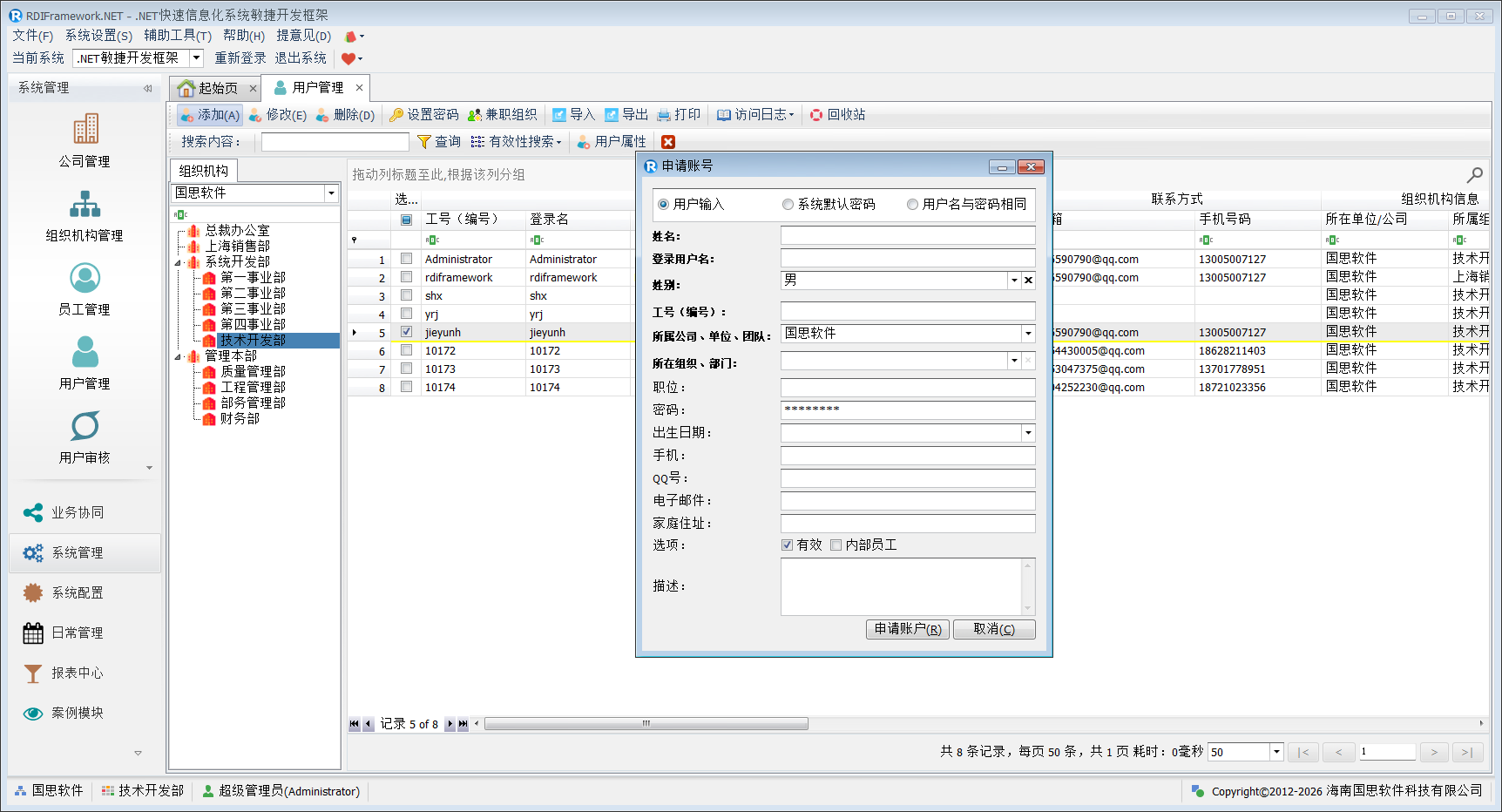 在添加用户操作界面,操作员可以添加能登录到框架使用系统相应功能的登录用户。需要注意的是,登录用户名与编号不能与已有的登录用户名、编号重复且不能为空。可以设置其有效性,只有当用户设置为"有效",用户才可以登录到系统。建议:如果某个用户离职或暂时不允许其登录,可以取消用户的"有效"标志。这样用户就不能登录到系统,而不是直接删除用户。申请账户时如果选中了内部员工,则创建用户的同时会同步创建用户对应的员工档案。这儿特别说明的是:非超级管理员申请(增加)的账户需要进行审核后才可以启用,"申请账户"界面的"有效"标志为不可用状态。