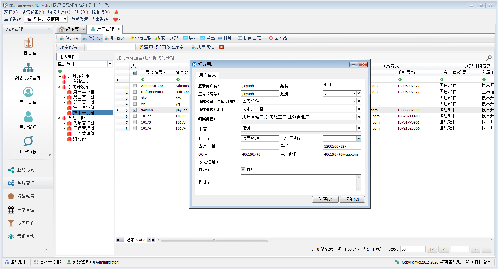 如果一个系统的操作用户很多,我们可以通过"用户管理"界面的搜索功能对特定用户进行搜索,此搜索功能是对全表进行模糊查询,只要输入一个关键字,就会把全表相应字段包含该关键字的信息过滤出来。并且我们框架提供了对用户有效性的搜索,可以方便的查看有效用户,无效用户,全部用户等。