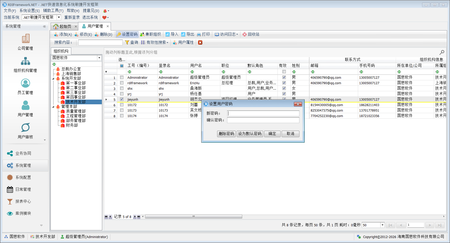 在用户管理主界面,有用户管理相应操作权限的登录用户可以添加、修改、删除(单个或批量删除)、设置密码、查询用户。此模块一般分配给具有系统管理员角色的用户,以防误操作,超级管理员用户不允许被修改与删除。当然,对于框架核心数据删除操作都是逻辑删除而非物理删除。即删除是在相应记录上打上了删除标志。若要恢复误删的数据,可以联系具有操作数据库的用户(如:DBA)进行数据恢复。在此界面上仅实现了用户管理服务接口部分常用功能,其他功能在服务层都已完美实现,用户可做相应的扩展,具体可参考框架的服务接口帮助文件。