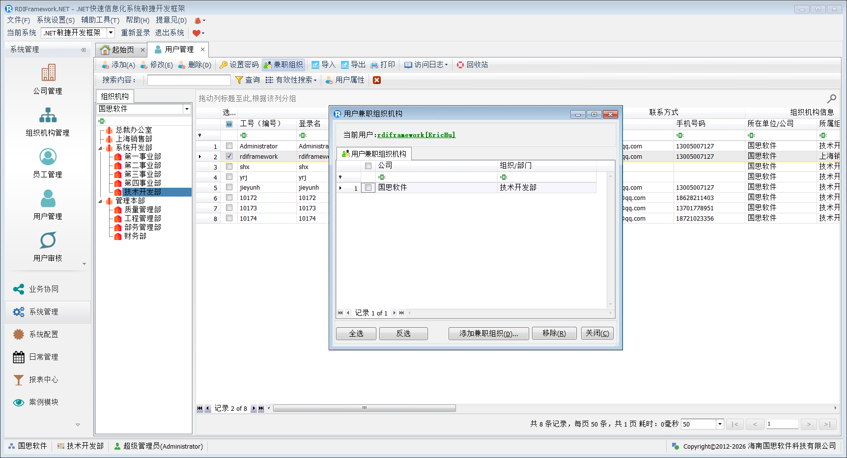 在"用户兼职组织机构"界面,我们可以对当前所选用户"添加兼职组织",如下图所示,同样对已设置的兼职组织可以进行"移除"操作,对于多条数据我们也可以进行"全选"、"反选"操作来加快操作的速度。