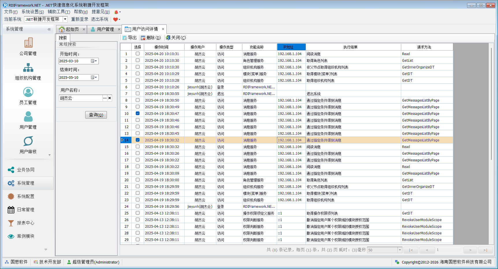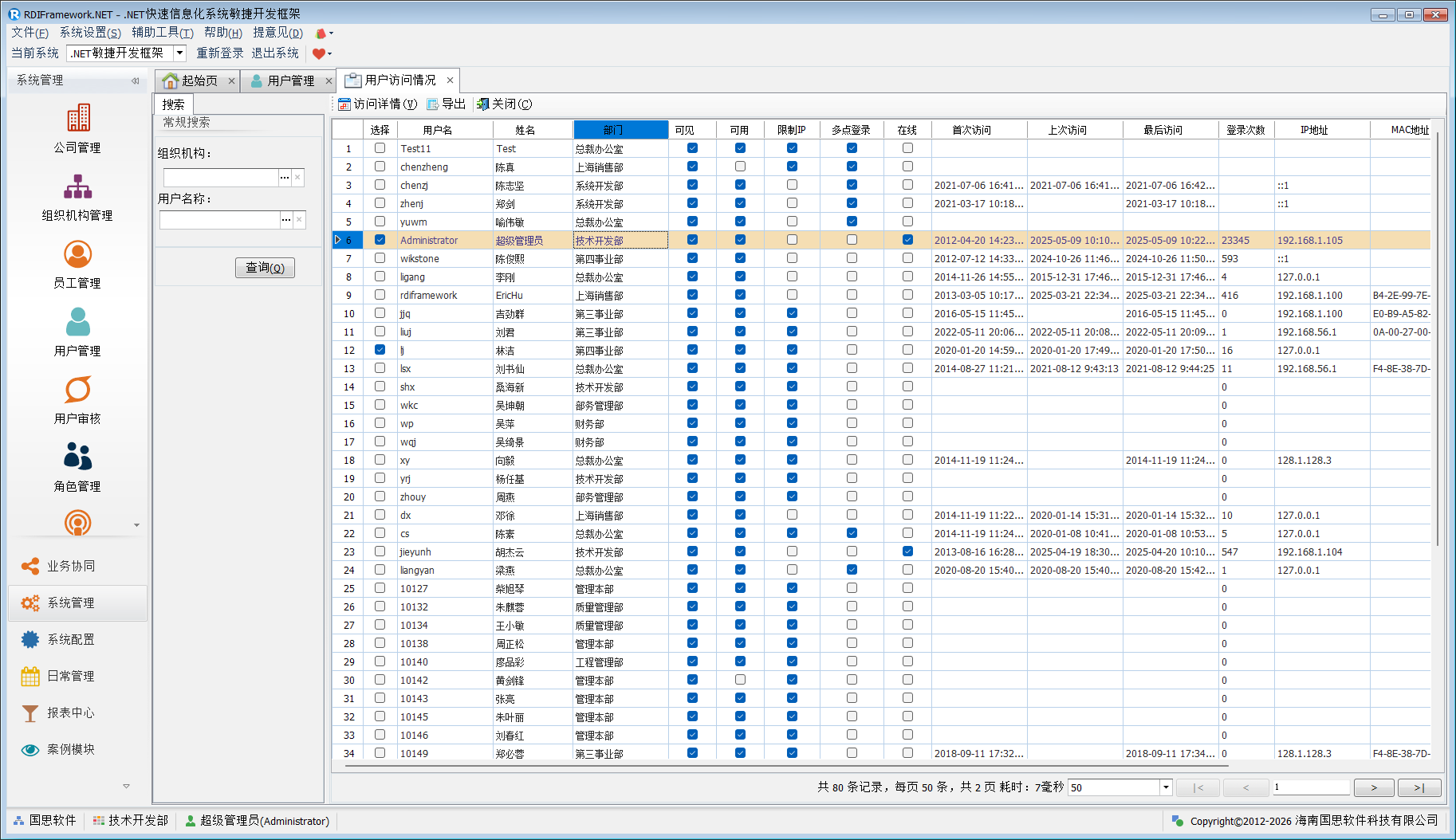在用户管理界面直接可以方便的查看指定用户对系统的访问情况,值得说明的时,这两个窗体是直接显示在主界面的 Tab 中的,而不是弹出窗口的形式。在"用户管理"主界面选择"访问日志"->"用户访问详情",就可以打开"用户访问详情"界面,在这儿显示了所选用户对系统的访问情况,操作情况等,如下图所示。