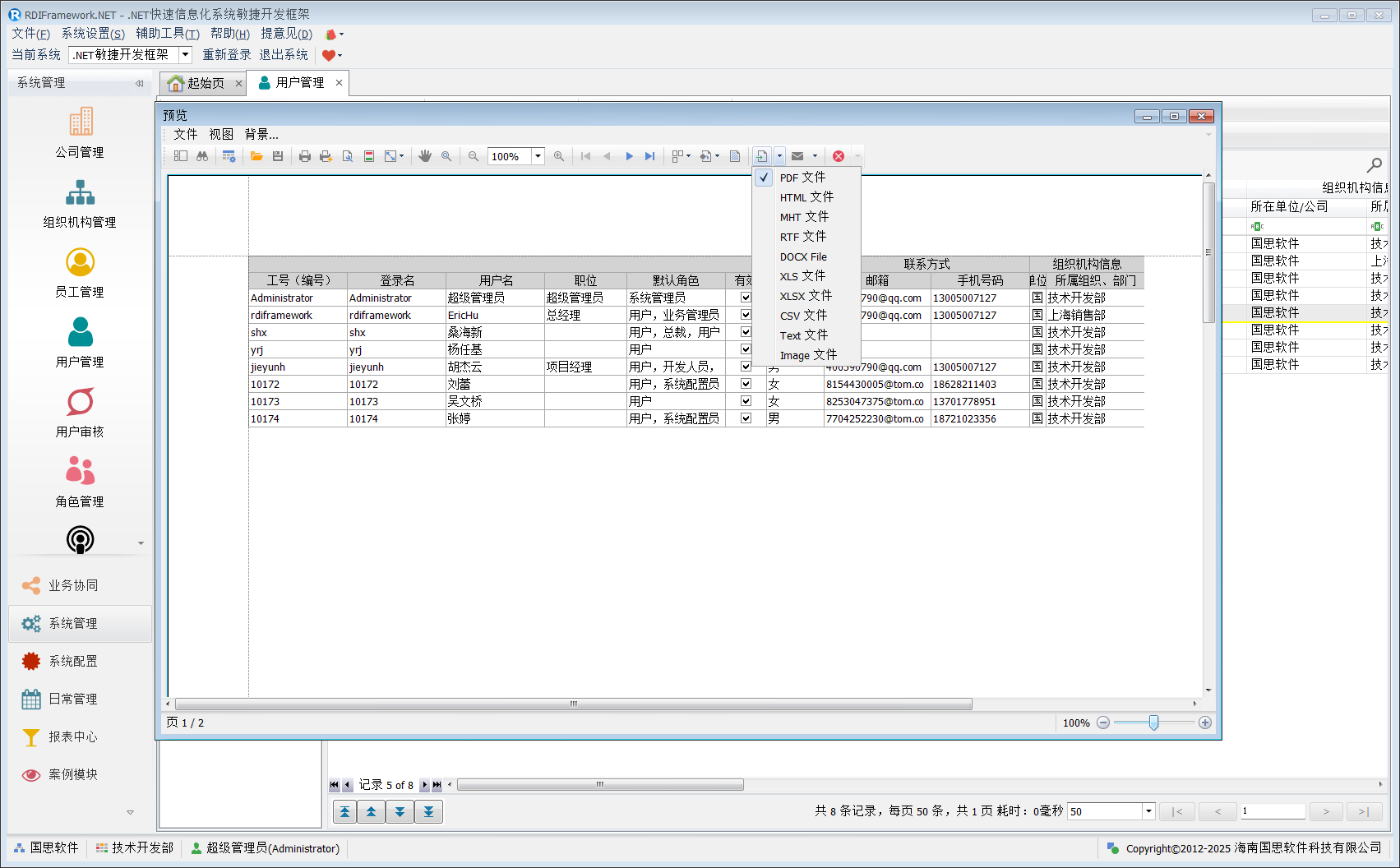 在用户打印界面,我们可以对打印的数据输出到各种格式,如:PDF 文件,HTML 文件,Excel 文件等,也可以直接邮件发送当前打印数据,还可以设置打印的水印等,在打印窗口都可以设置,功能非常的丰富。