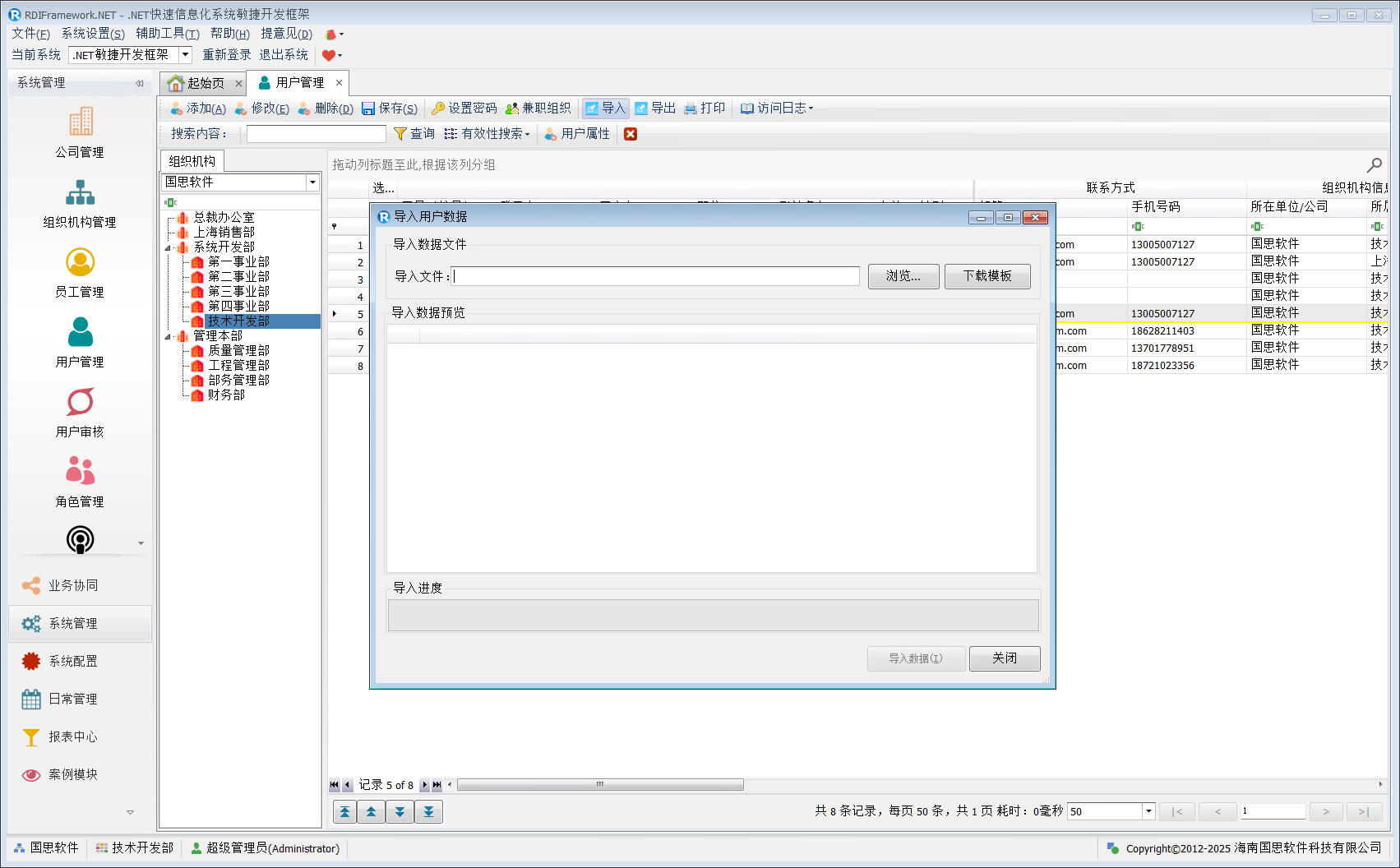用户导入功能在系统初始阶段非常的适用,操作人员可以根据我们提供的用户导入模版 Excel 文件,把初始数据放在 Excel 中进行一键批量导入的操作,用户导入主界面如下图所示。