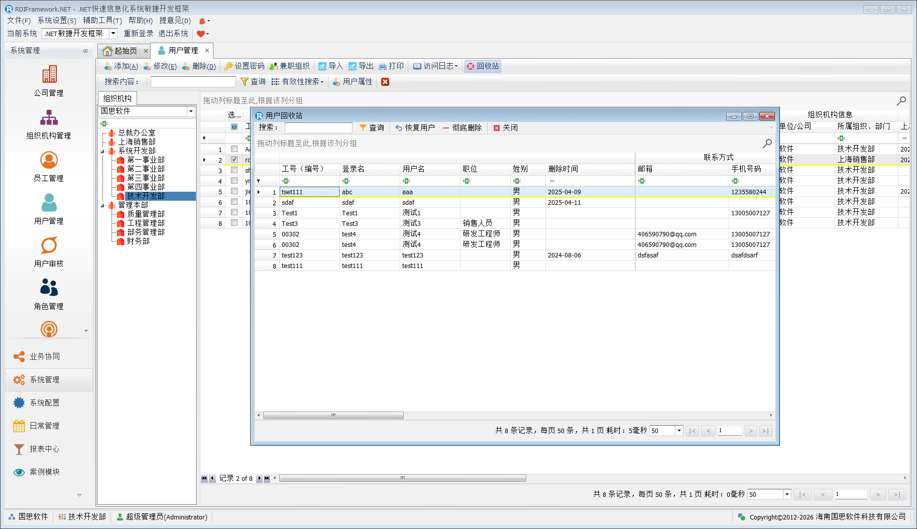在用户管理主界面,单击"回收站"按钮,即可打开用户回收站界面,如下图所示。