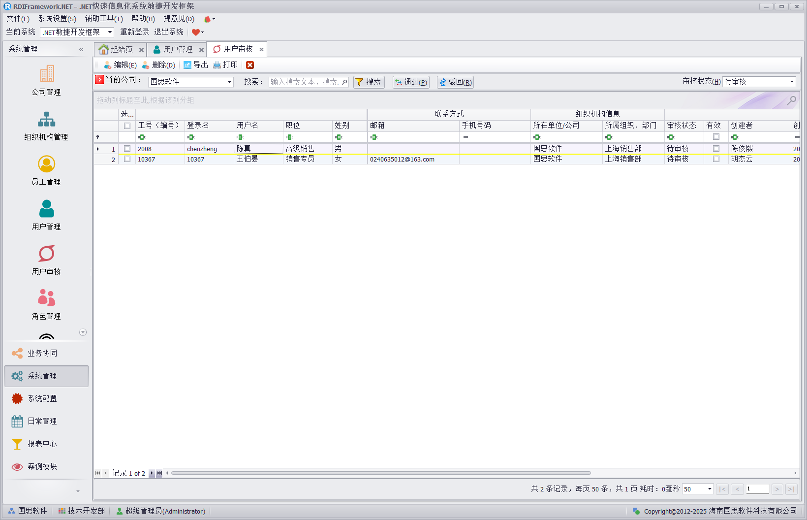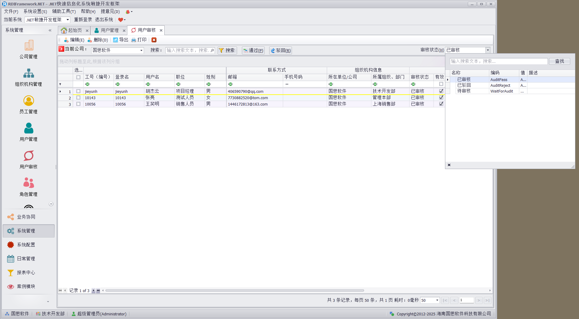 在前面的的章节,我们讲了如果不是超级管理员增加的用户,用户来源是其他方式(如:用户自己申请,或者其他的有用户管理权限的用户增加的数据)则需要通过审核通过才能成为有效并成功使用系统的用户。"用户审核"主界面如下图所示。