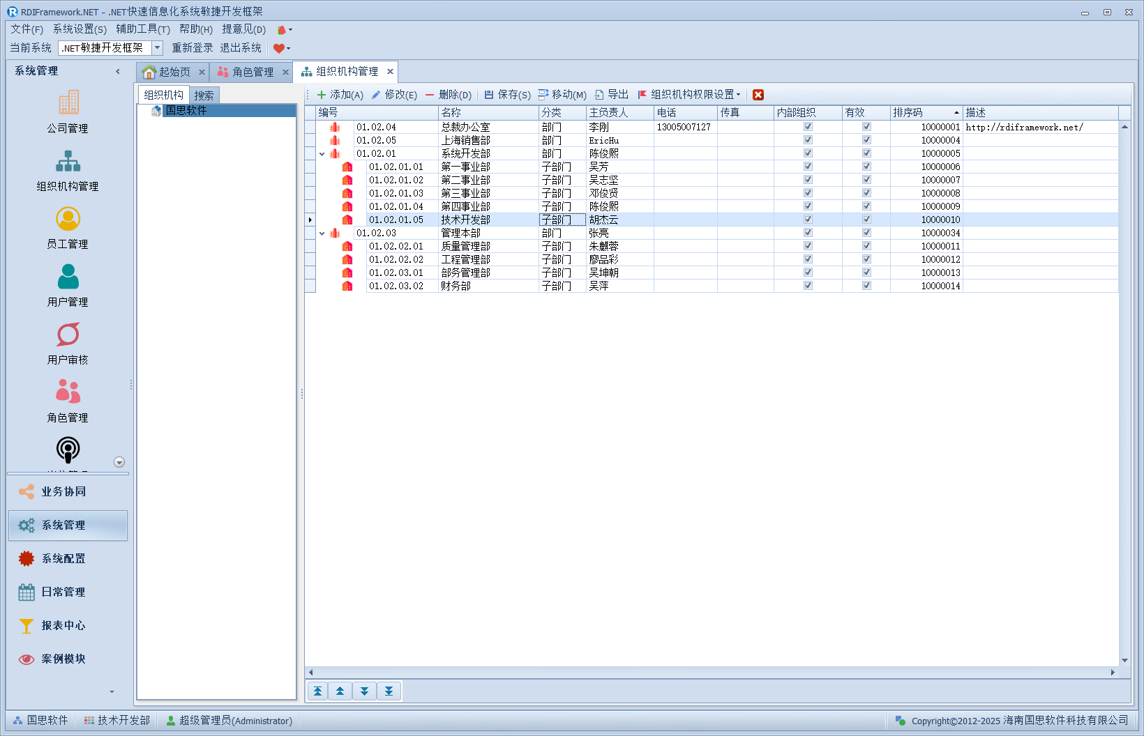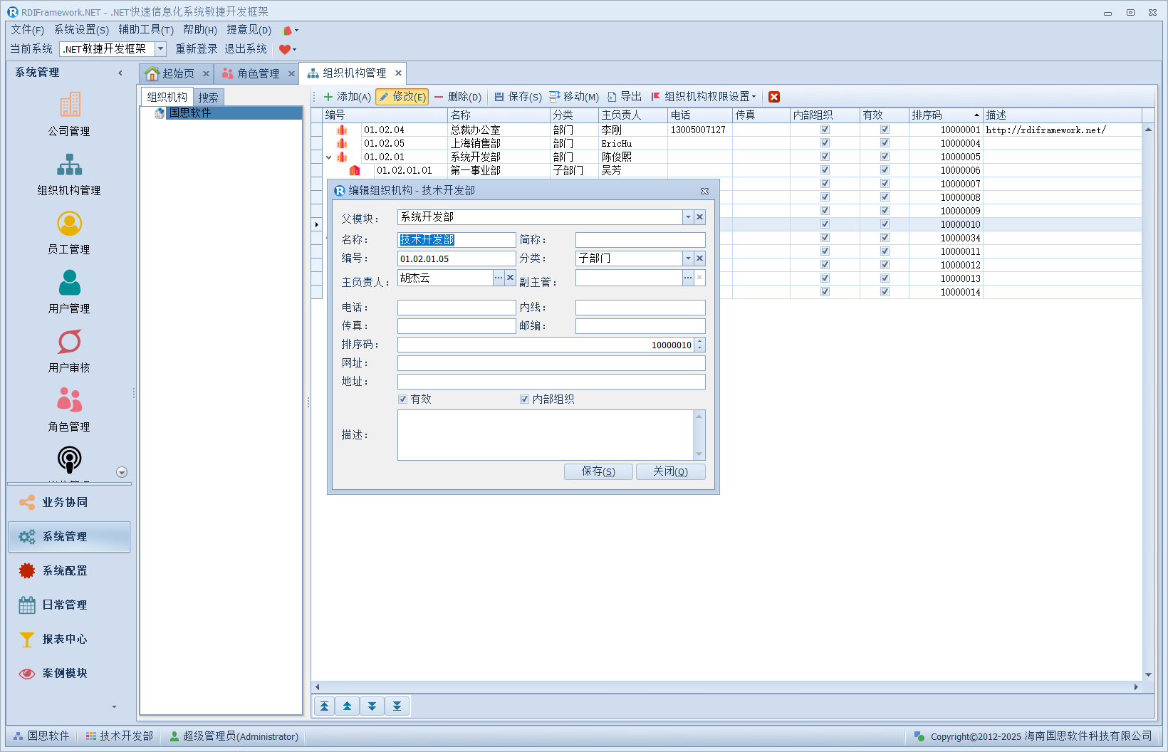 组织机构管理模块提供直观方便的组织机构管理,以树型结构显示单位和部门的机构体系,可根据需要进行添加、修改、删除或移动等对组织机构进行调整处理。功能特点: