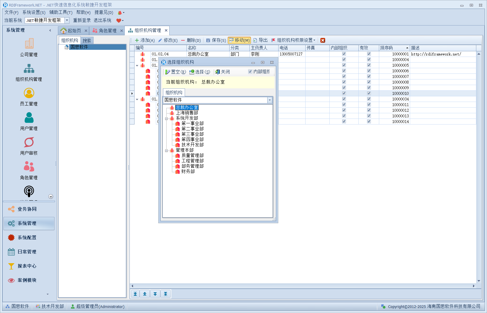 支持树目录拖动功能,灵活高效,极大的方便用户操作,提供直观的机构部门管理功能。