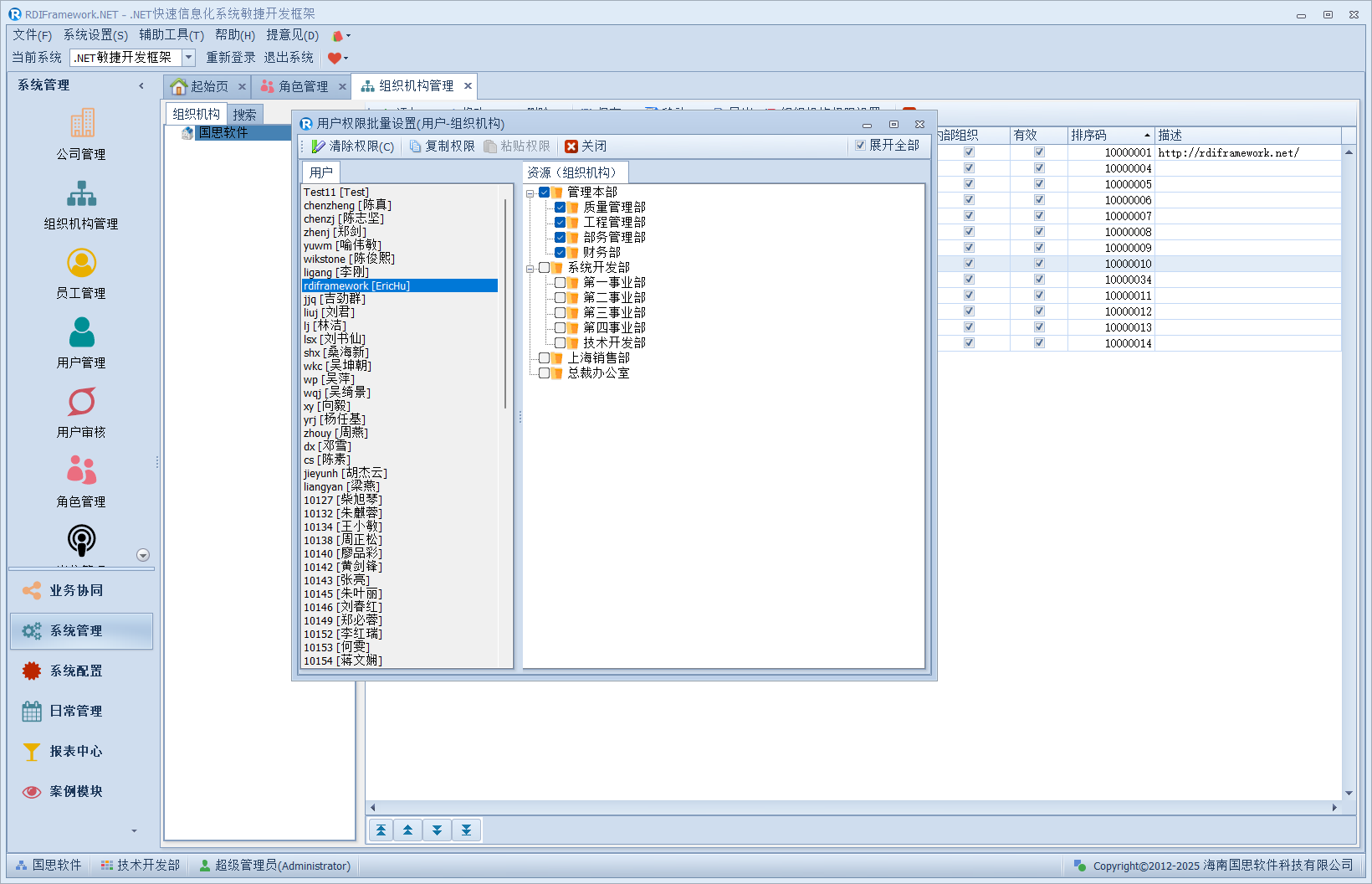 用户、角色组织机构权限设置(主要对用户后期资源权限的设置,设置用户、角色可以管理的组织机构资源权限范围)。