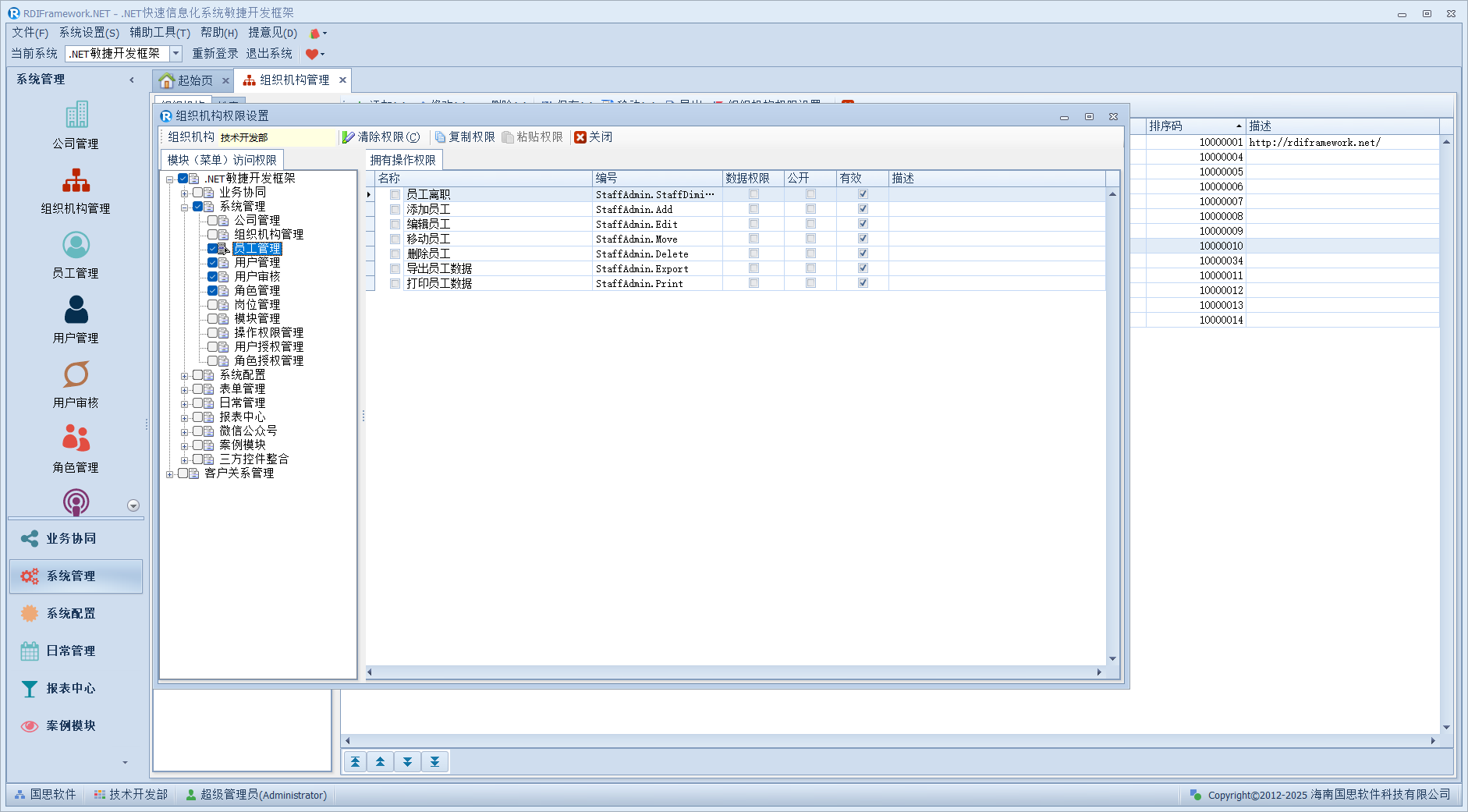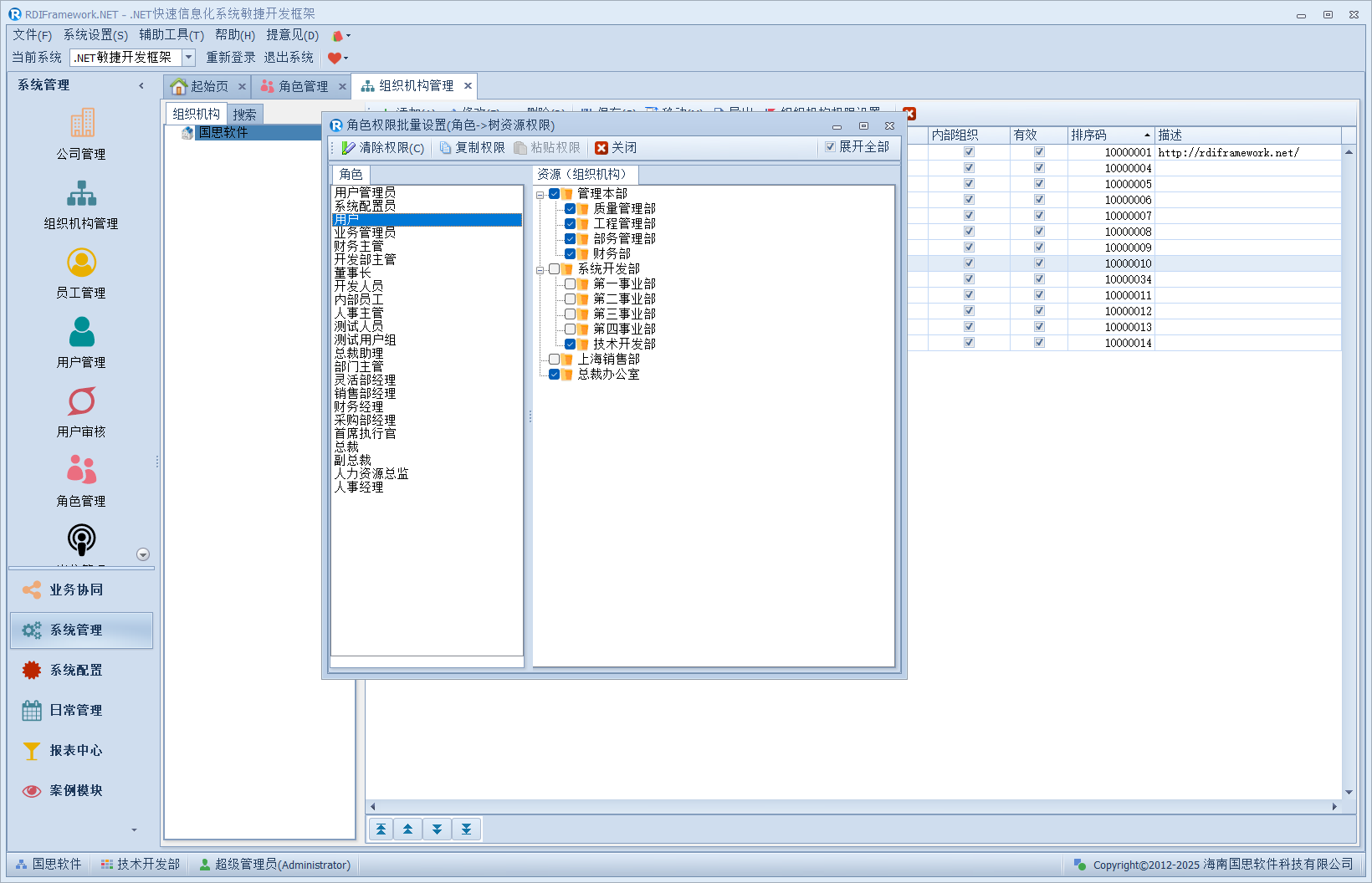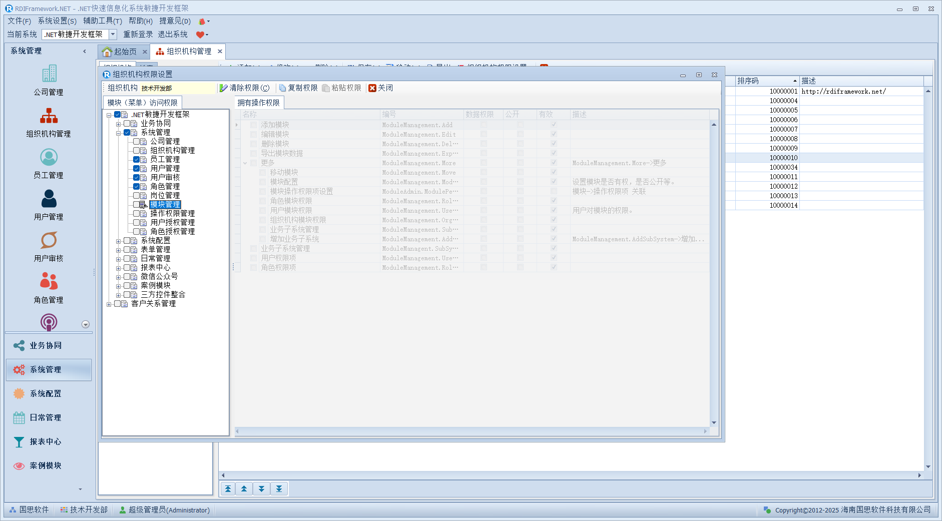 对于某些大型的企业、信息系统,涉及的组织机构较多,模块多、操作权限也多,对用户或角色一一设置模块、操作权限等比较繁琐。我们可以直接对某一组织机构进行权限的设置,这样设置后,同一组织机构的用户就可以拥有相应的模块访问权限,操作权限了,这样也能减轻管理人员的负担。要启用组织机构权限,需要配置 Config.xml 配置节"EnableOrganizePermission"为 True,组织机构权限设置如下图所示。