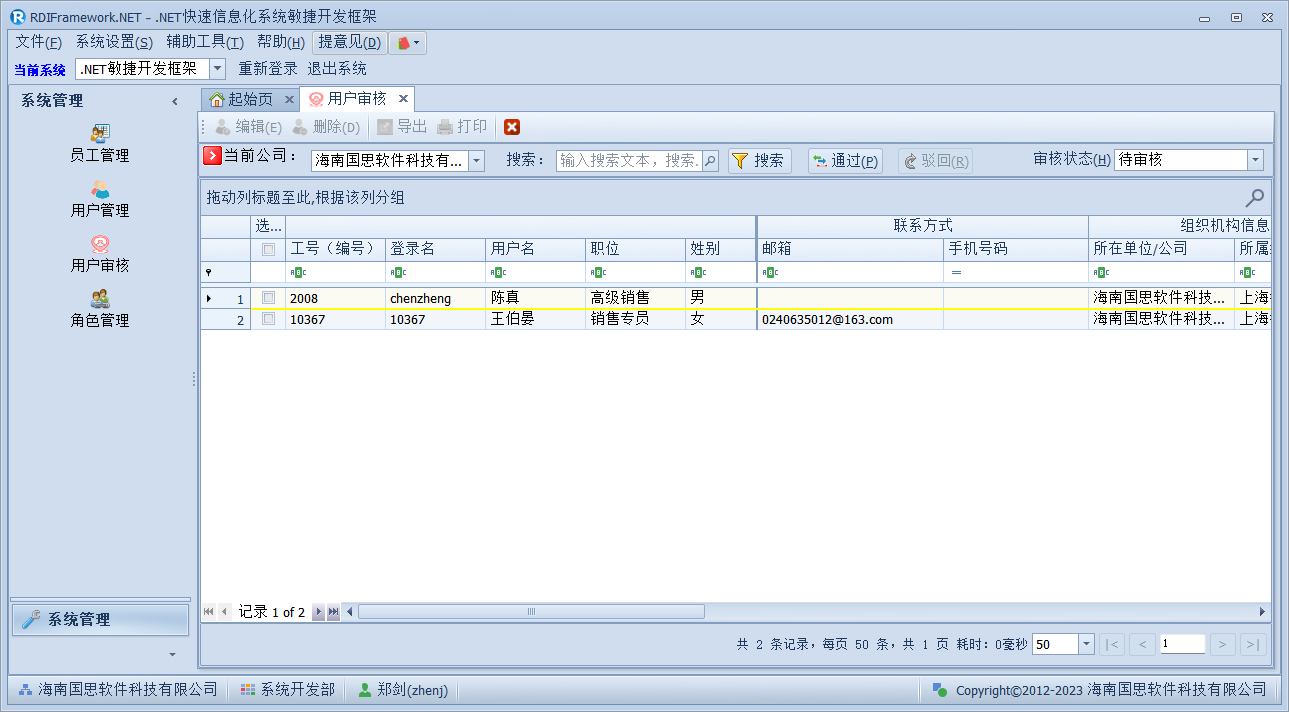 通过上图可以看到,用"系统开发部"组织机构下的用户登录进来后,该用户就拥有了我们设置的模块(含公开模块)与操作权限。