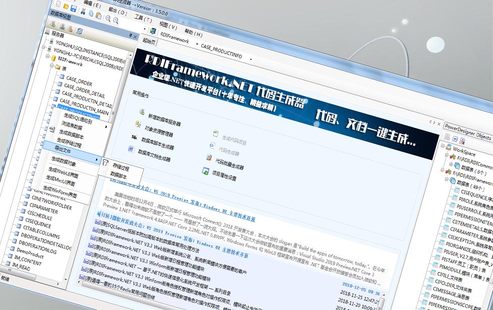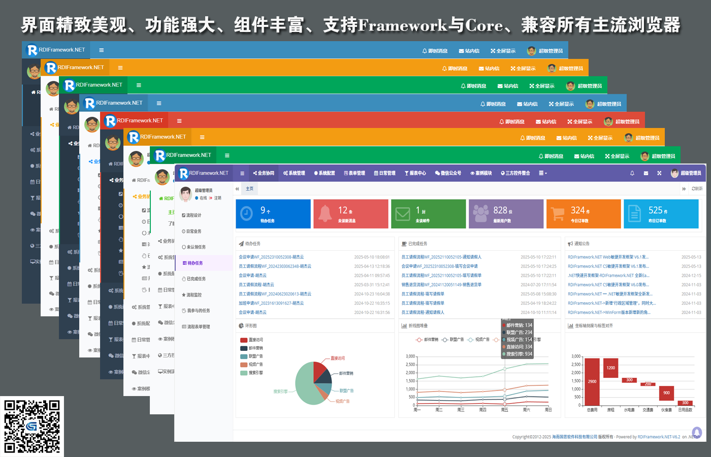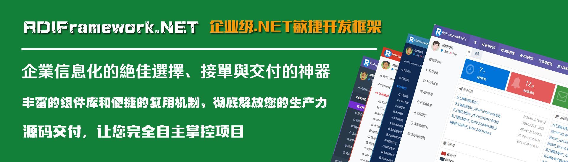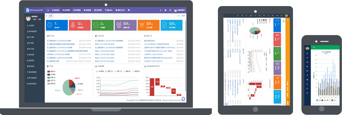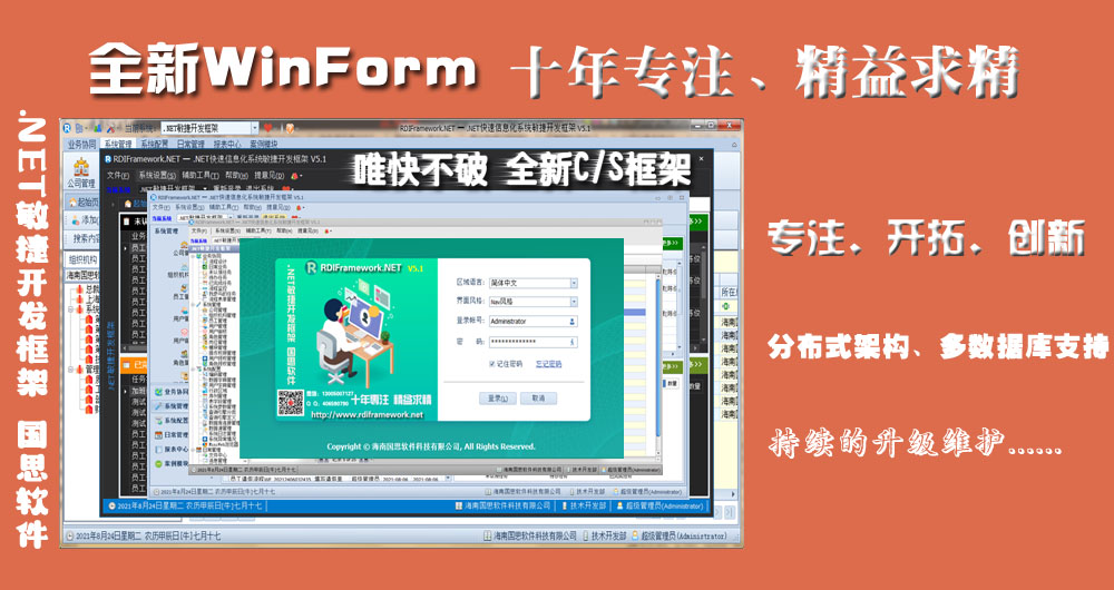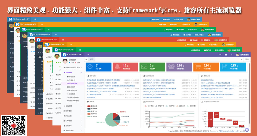框架采用主流的C#语言开发完成,支持多种数据库类型,支持BS、CS,支持Framework与Core双引擎。 使用RDIFramework.NET敏捷开发框架能提高管理类软件系统的整体质量、提高模块与模块之间的兼容性、提高代码的重复利用率,使软件系统架构更加合理、质量更加过硬,使得劳动成果最大程度上重复利用。 框架基础模块包括:强大灵活的权限控制组件,模块分配与管理组件,灵活易用的工作流组件、表单在线设计组件、数据字典管理组件,丰富的报表统计组件、即时通讯(IM)组件、邮件中心组件、微信开发相关组件、任务调度组件、自动升级组件、多语言模块,各种常用的商业控件,强大的代码生成器,开发实例、丰富的基础类库、开发辅助工具等各基础常用功能组件。 框架提供大量通用插件,支持Saas多租户模式,完成功能的开发就像搭积木一样,只需要把各种组件进行组合拼装,拼装好了系统的开发也就完成了。应用系统建立在此框架之上,采用构件式、可复用开发,节省开发成本,加快开发速度,在软件开发上更好的做到多快省。 适合低中高任意开发水平的开发者,可以开发OA、ERP、BPM、CRM、WMS、TMS、MIS、BI、电商平台后台、物流管理系统、医院管理系统、快递管理系统、教务管理系统等各类管理软件、支持大并发、SaaS应用。代码稳定、组件丰富、功能强大、无限扩展。由框架开发团队的原班人马直接提供技术支持,为您顺利完成开发工作保驾护航。不管您是零基础还是专业开发人员,都能轻松驾驭这套开发框架。