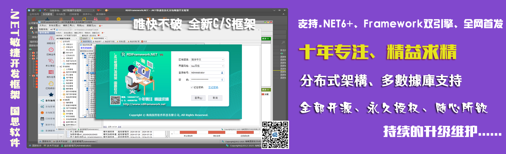 框架采用主流的C#语言开发完成,支持多种数据库类型,支持 BS、CS, 支持.NET Framework与.NET6+, 使用RDIFramework.NET敏捷开发框架能提高管理类软件系统的整体质量、提高模块与模块之间的兼容性、提高代码的重复利用率,使软件系统架构更加合理、质量更加过硬,使得劳动成果最大程度上重复利用。 框架基础模块包括:强大灵活的权限控制组件,模块分配与管理组件,灵活易用的工作流组件、数据字典管理组件,丰富的报表统计组件、即时通讯(IM)组件、自动升级组件、多语言模块,各种常用的商业控件,强大的代码生成器,开发实例、丰富的基础类库、开发辅助工具等各基础常用功能组件。 框架提供的大量通用插件,支持Saas多租户模式,完成功能的开发就像搭积木一样,只需要把各种组件进行组合拼装,拼装好了系统的开发也就完成了。应用系统建立在此框架之上,采用构件式、可复用开发,节省开发成本,加快开发速度,在软件开发上更好的做到多快省。 适合低中高任意开发水平的开发者,可以开发OA、ERP、BPM、CRM、WMS、TMS、MIS、BI、电商平台后台、物流管理系统、医院管理系统、快递管理系统、教务管理系统等各类管理软件、支持大并发、SaaS应用。代码稳定、组件丰富、功能强大、无限扩展。由框架开发团队的原班人马直接提供技术支持,为您顺利完成开发工作保驾护航。不管您是零基础还是专业开发人员,都能轻松驾驭这套开发框架。